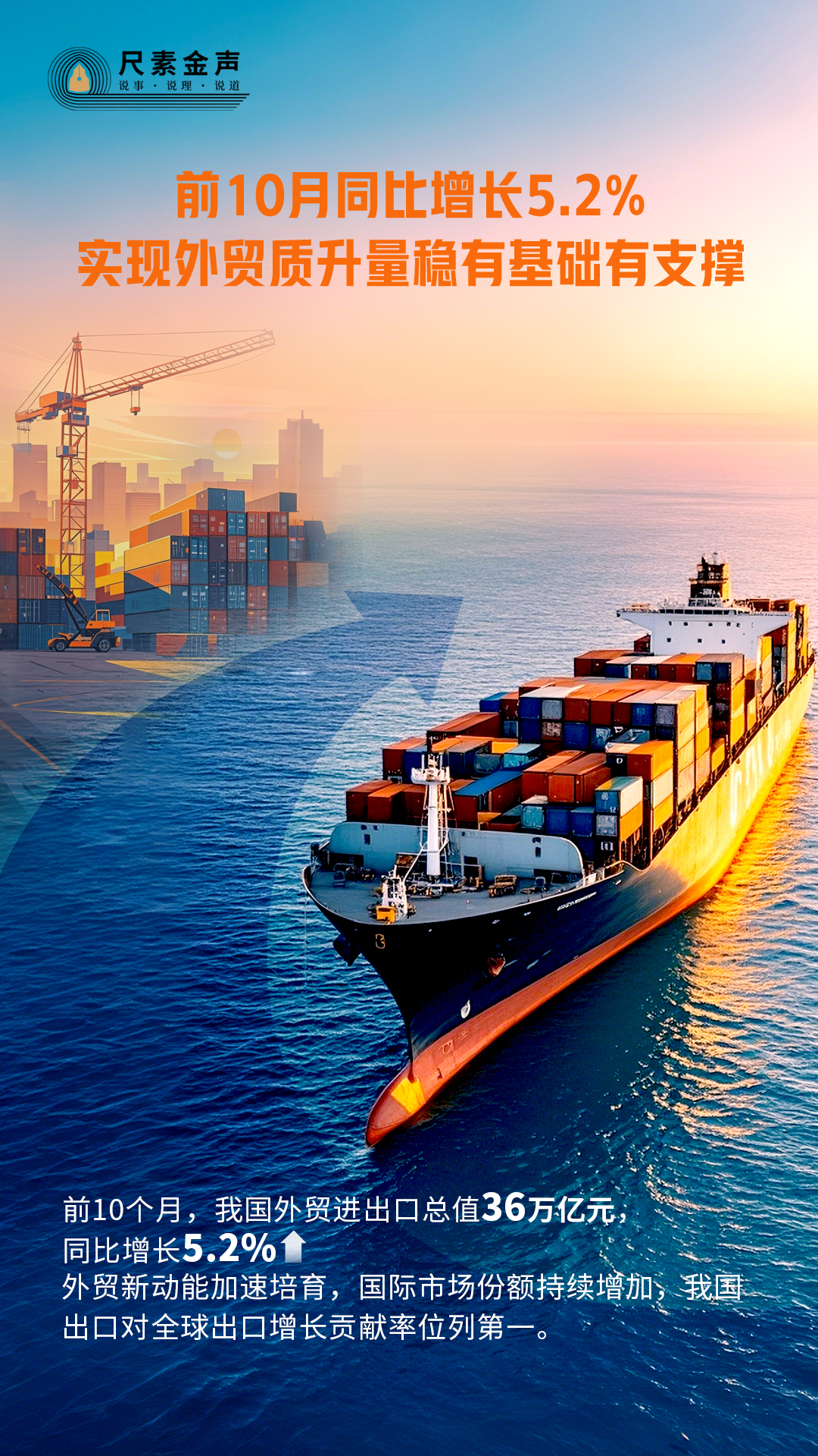 海关数据显示,本年以来,展示出较强韧性。前10个月,我国外贸进出口总值36万亿元,同比增加5。2%。 外贸新动能加快培育,国际市场份额持续添加,我国出口对全球出口增加贡献率位列第一。中国外贸成长全体连结了质升量稳的优良成长势头。