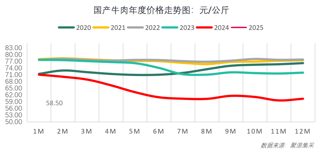 2025年1月,国产牛肉均价58。50元/公斤,环比下跌-1。83元/公斤,同比下跌-11。65元/公斤,月内全国牛肉市场价钱大幅下跌。正在春节前期国产鲜牛肉供应过剩,加之海外进口牛肉量大,以及下逛消费不达预期等多种要素的影响下,牛肉价钱持续刷新最低价,本期牛肉报价为近六年来最低报价。